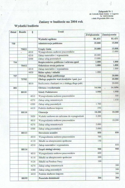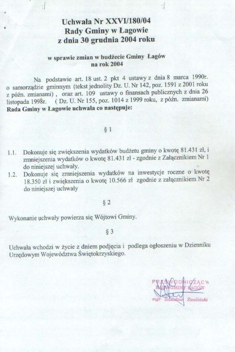| Uchwała nr XXVI/180/04 Rady Gminy w Łagowie z dn. 30 grudnia 2004 r. w sprawie zmian w budżecie Gminy Łagów na rok 2004. | 2008-10-22 |