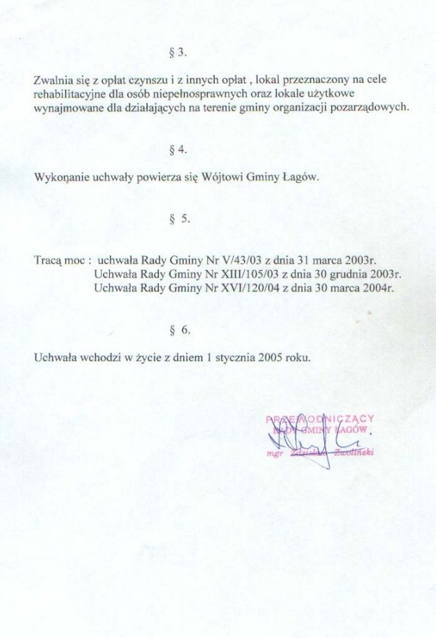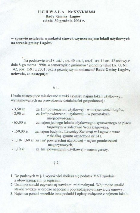 | Uchwała nr XXVI/183/04 Rady Gminy w Łagowie z dn. 30 grudnia 2004 r. w sprawie ustalenia wysokości stawek czynszu najmu lokali użytkowych na terenie gminy Łagów. | 2008-10-22 |