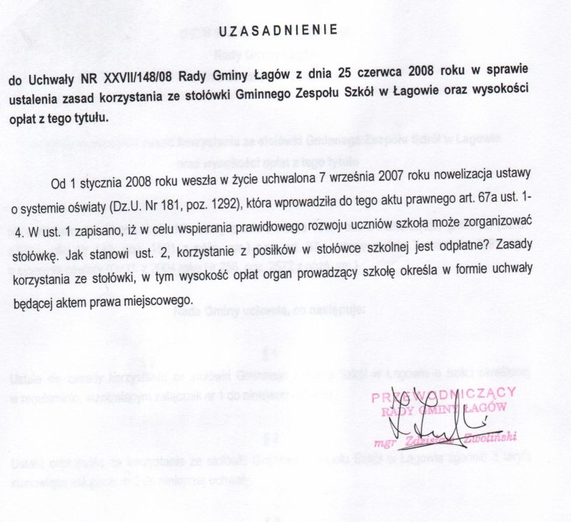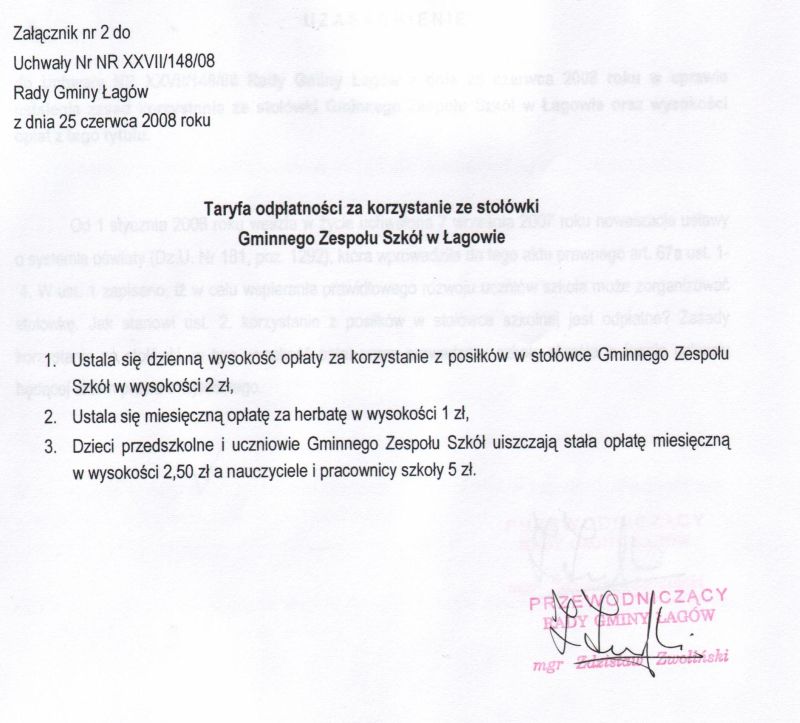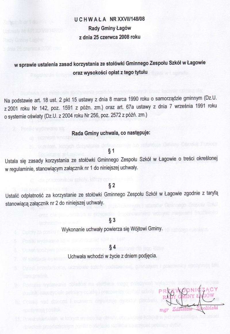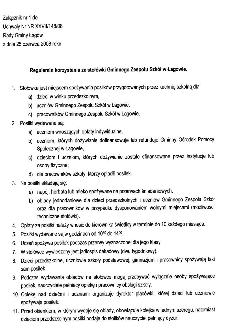 | Uchwała nr XXVII/148/08 Rady Gminy Łagów z dnia 25 czerwca 2008 r. w sprawie ustalenia zasad korzystania ze stołowki Gminnego Zespołu Szkół w Łagowie oraz wysokości opłat z tego tytułu | 2008-08-21 |