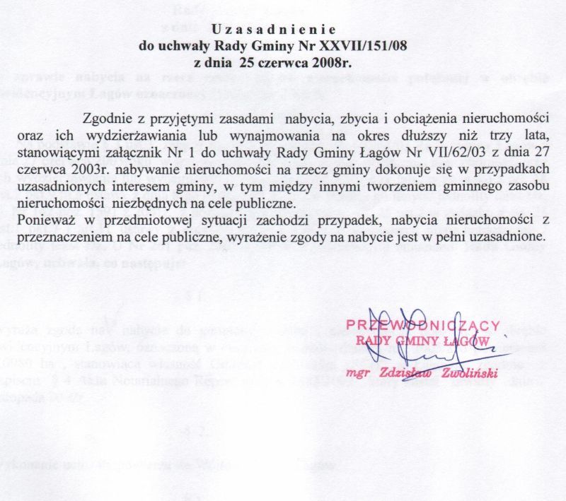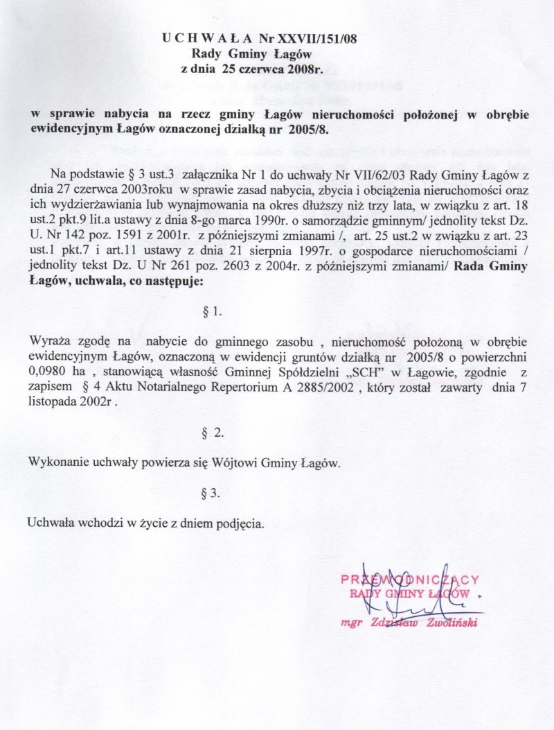 | Uchwała nr XXVII/151/08 Rady Gminy Łagów z dnia 25 czerwca 2008 r. w sprawie nabycia na rzecz gminy Łagów nieruchomości położonej w obrębie ewidencyjnym Łagów oznaczonej działką nr 2005/8 | 2008-08-21 |