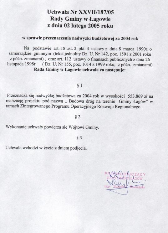 | Uchwała nr XXVII/187/05 Rady Gminy w Łagowie z dn. 2 lutego 2005 r. w sprawie przeznaczenia nadwyżki budżetowej za 2004 rok. | 2008-10-17 |