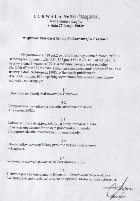 | Uchwała nr XXVII/204/02 Rady Gminy w Łagowie z dn. 27 lutego 2002 r. w sprawie likwidacji Szkoły Podstawowej w Czyżowie. | 2008-10-31 |