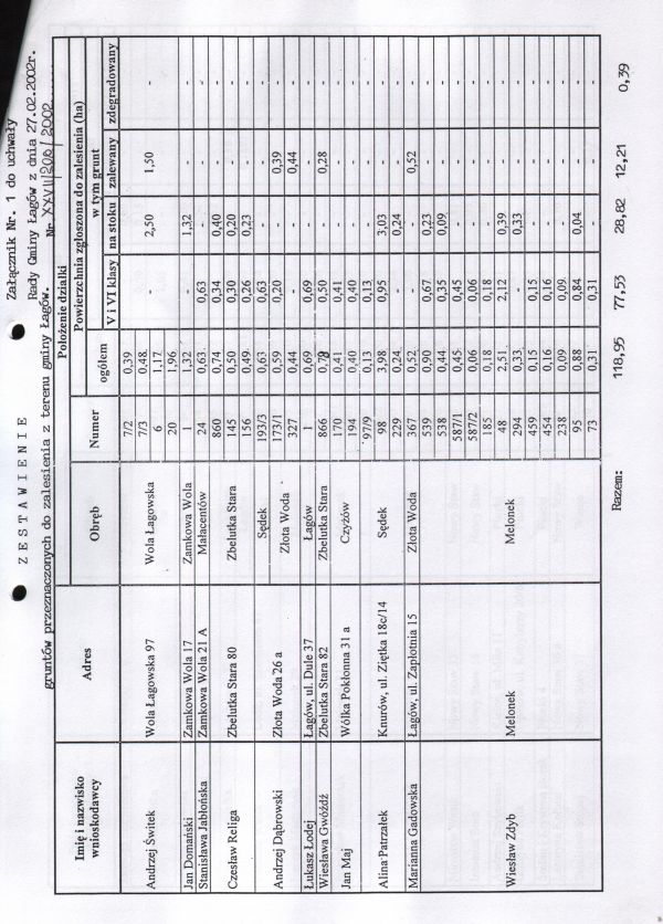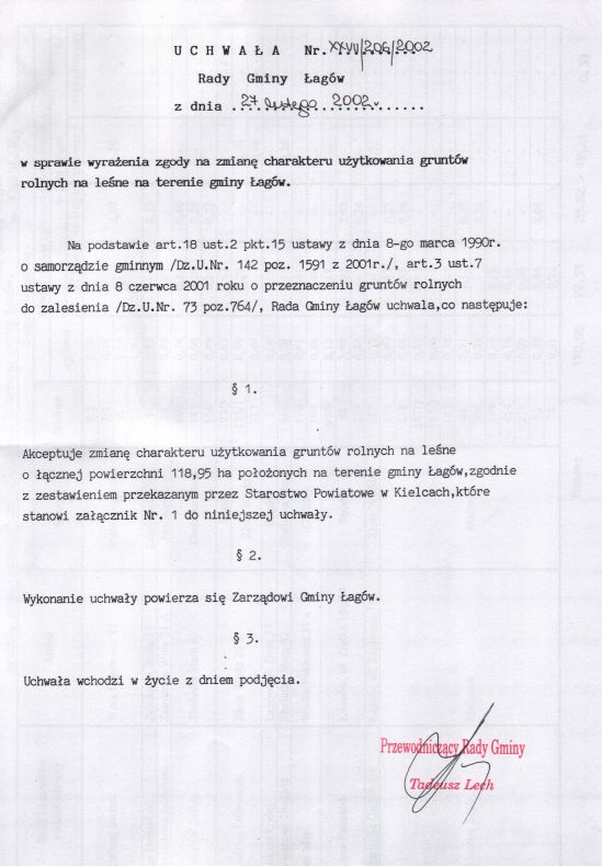 | Uchwała nr XXVII/206/02 Rady Gminy w Łagowie z dn. 27 lutego 2002 r. w sprawie wyrażenia zgody na zamianę charakteru użytkowania gruntów rolnych na leśne na terenie gminy Łagów. | 2008-10-31 |