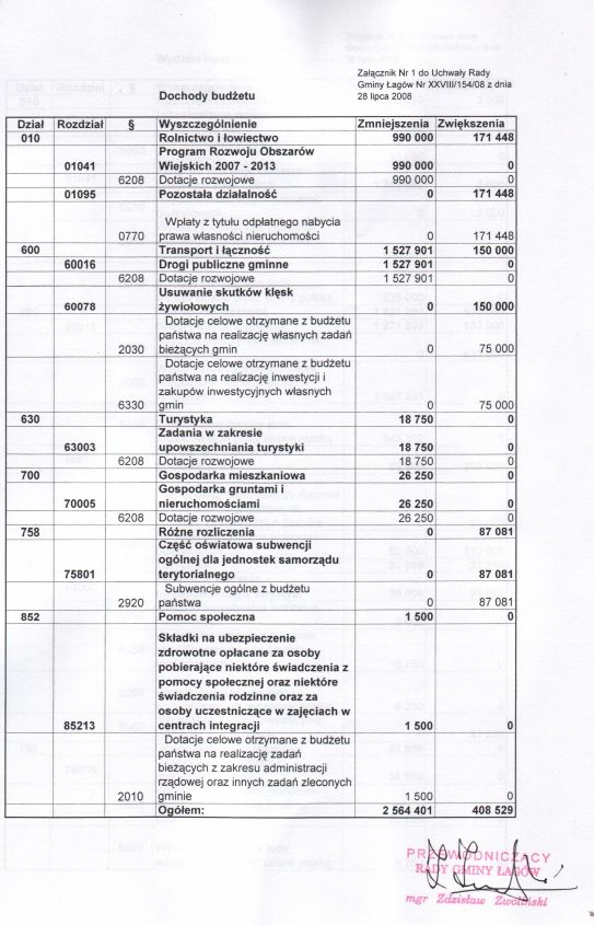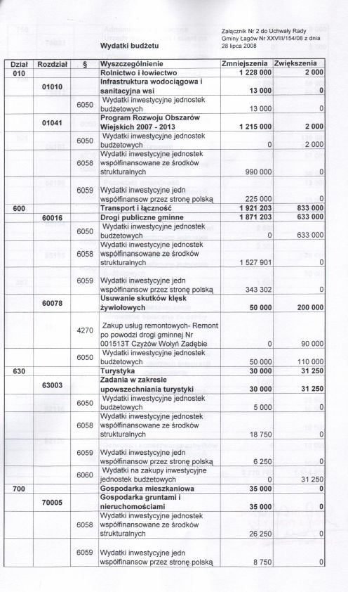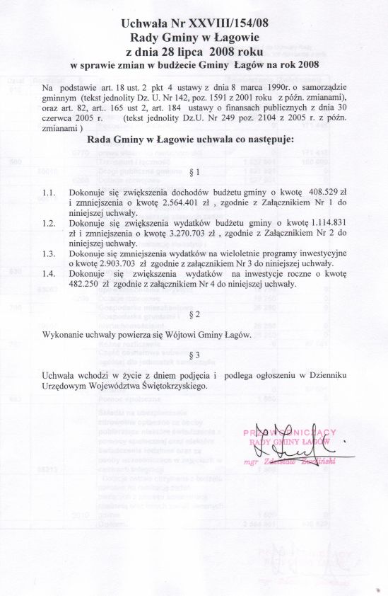 | Uchwała nr XXVIII/154/08 Rady gminy Łagów z dnia 28 lipca 2008 r. w sprawie zmian w budżecie Gminy Łagów na rok 2008 | 2008-10-02 |
