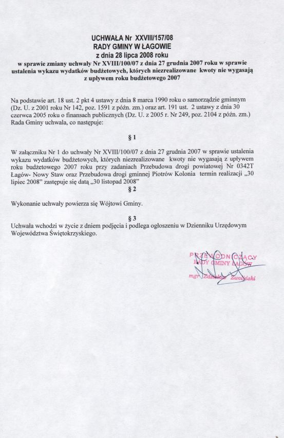 | Uchwała nr XXVIII/157/08 Rady Gminy Łagów z dnia 28 lipca 2008 r. w sprawie zmiany uchwały nr XVIII/1000/07 z dnia 27 grudnia 2007 r. | 2008-10-02 |