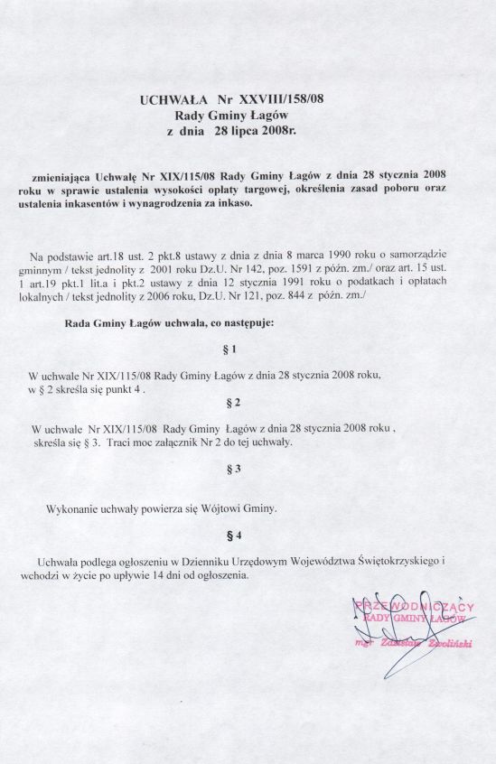 | Uchwała nr XXVIII/158/08 Rady Gminy Łagów z dnia 28 lipca 2008 r. zmieniająca uchwałę nr XIX/115/08 z dnia 28 stycznia 2008 r. | 2008-10-02 |