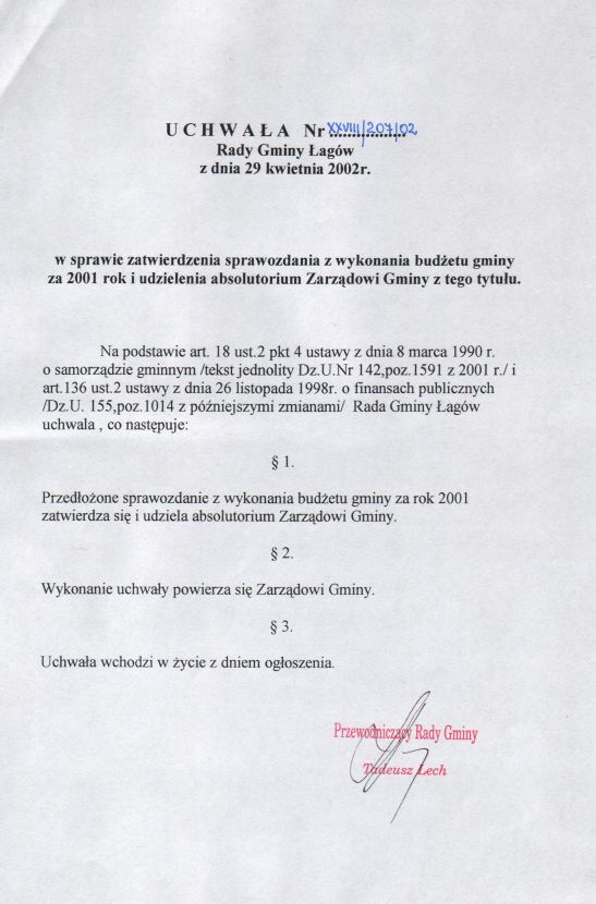 | Uchwała nr XXVIII/207/02 Rady Gminy w Łagowie z dn. 29 kwietnia 2002 r. w sprawie zatwierdzenia sprawozdania z wykonania budżetu gminy za 2001 rok i udzielenia absolutorium Zarzadowi Gminy z tego tytułu. | 2008-10-31 |