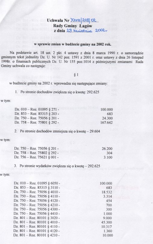 | Uchwała nr XXVIII/208/02 Rady Gminy w Łagowie z dn. 29 kwietnia 2002 r. w sprawie zmian w budżecie gminy na 2002 rok. | 2008-10-31 |