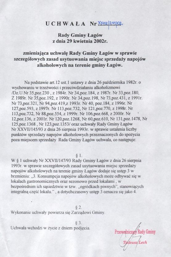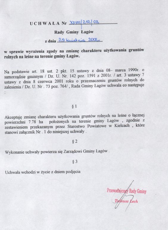 | Uchwała nr XXVIII/212/02 Rady Gminy w Łagowie z dn. 29 kwietnia 2002 r. w sprawie wyrażenia zgody na zmianę charakteru użytkowania gruntów rolnych na leśne na terenie gminy Łagów. | 2008-10-31 |
