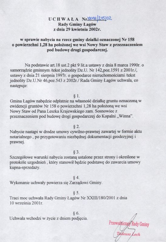 | Uchwała nr XXVIII/215/02 Rady Gminy Łagów z dn. 29 kwietnia 2002 r. w sprawie nabycia na rzecz gminy działki oznaczonej nr 158 o powierzchni 1,28 ha położonej we wsi Nowy Staw z przeznaczeniem pod budowę drogi gospodarczej. | 2008-10-31 |