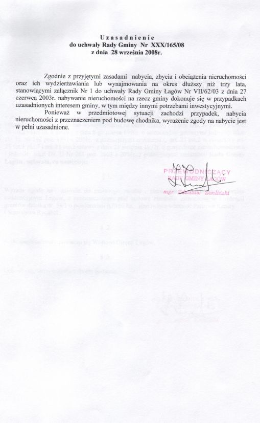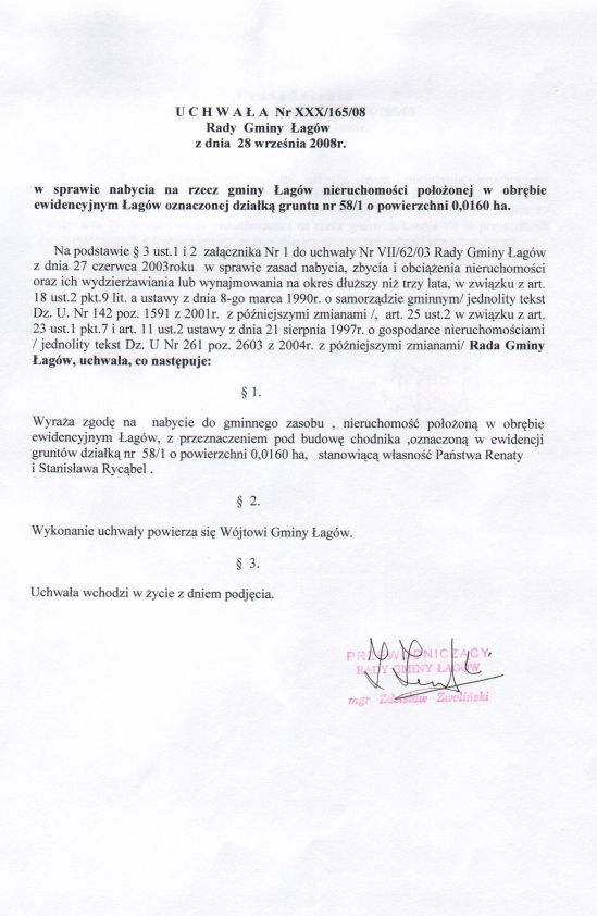 | Uchwała nr XXX/165/08 Rady Gminy Łagów z dnia 28 września 2008 r. w sprawie nabycia na rzecz gminy Łagów nieruchomości położonej w obrębie ewidencyjnym Łagów | 2008-10-02 |