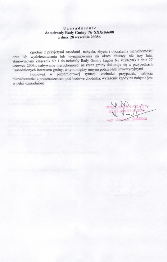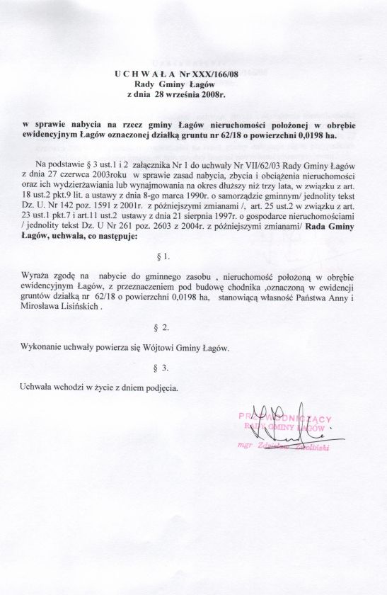 | Uchwała nr XXX/166/08 Rady Gminy Łagów z dnia 28 września 2008 r. w sprawie nabycia na rzecz gminy Łagów nieruchomości położonej w obrębie ewidencyjnym Łagów | 2008-10-02 |