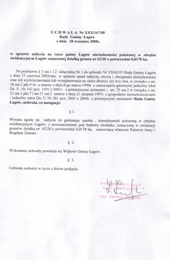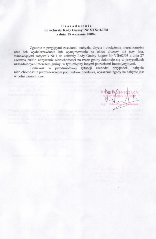 | Uchwała nr XXX/167/08 Rady Gminy Łagów z dnia 28 września 2008 r. w sprawie nabycia na rzecz gminy Łagów nieruchomości położonej w obrębie ewidencyjnym Łagów | 2008-10-02 |