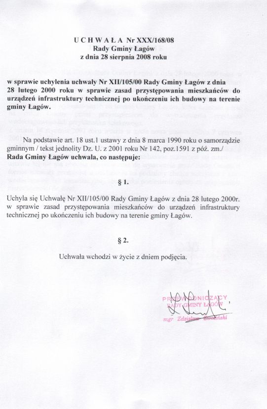 | Uchwała nr XXX/168/08 Rady Gminy Łagów z dnia 28 sierpnia 2008 r. w sprawie uchylenia uchwały nr XII/105/00 z dnia 28 lutego 2000r. | 2008-10-02 |