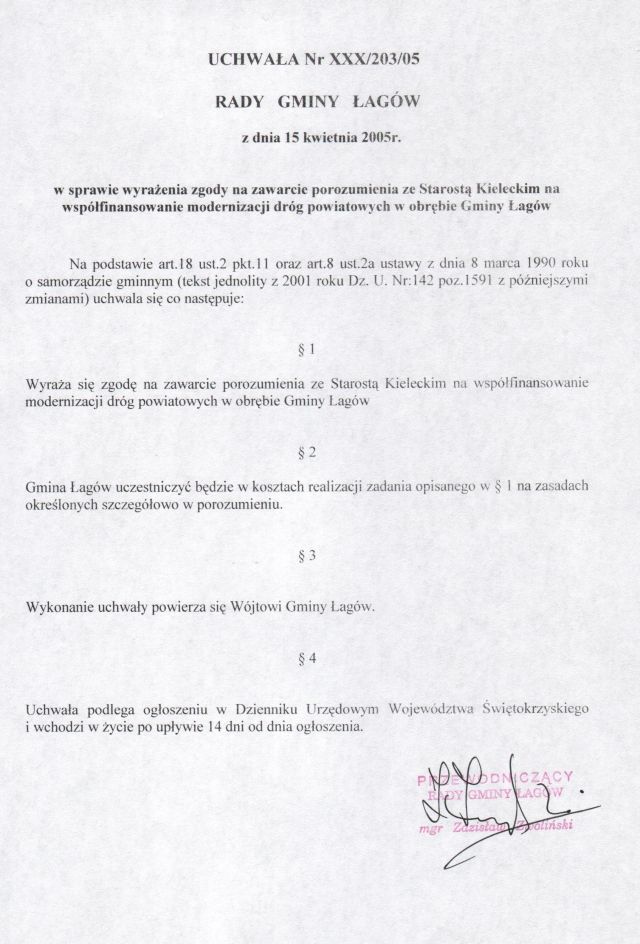| Uchwała nr XXX/203/05 Rady Gminy w Łagowie z dn. 15 kwietnia 2005 r. w sprawie wyrażenia zgody na zawarcie porozumienia ze Starostą Kieleckim na współfinansowanie modernizacji dróg powiatowych w obrebie Gminy Łagów. | 2008-10-17 |