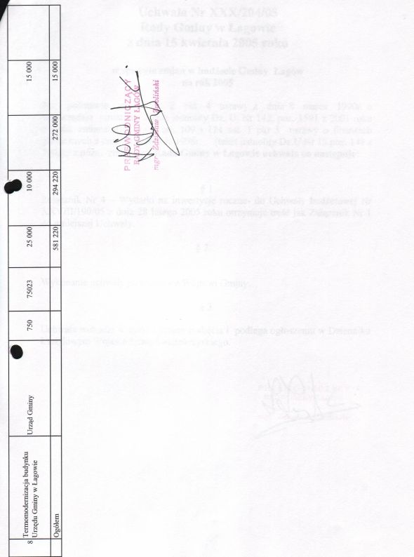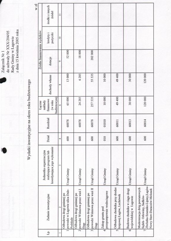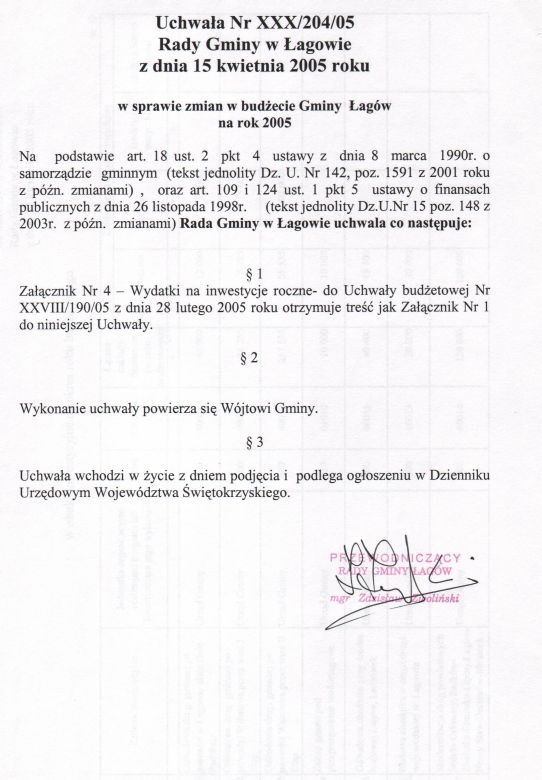 | Uchwała nr XXX/204/05 Rady Gminy w Łagowie z dn. 15 kwietnia 2005 r. w sprawie zmian w budżecie Gminy Łagów na rok 2005. | 2008-10-17 |