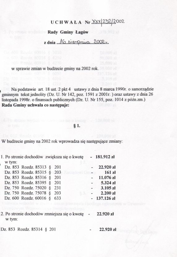 | Uchwała nr XXX/232/02 Rady Gminy Łagów z dn. 16 sierpnia 2002 r. w sprawie zmian w budżecie gminy na 2002 rok. | 2008-10-31 |