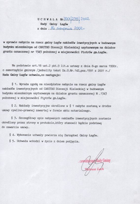 | Uchwała nr XXX/235/02 Rady Gminy Łagów z dn. 16 sierpnia 2002 r. w sprawie nabycia na rzecz gminy Łagów nakładów inwestycyjnych w budowanym budynku mieszkalnym od CARITAS Diecezji Kieleckiej. | 2008-10-31 |