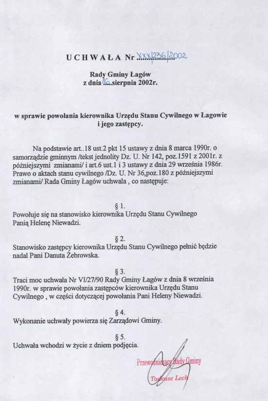 | Uchwała nr XXX/236/02 Rady Gminy Łagów z dn. 16 sierpnia 2002 r. w sprawie powołania kierownika Urzędu Stanu Cywilnego i jego zastępcy. | 2008-10-31 |
