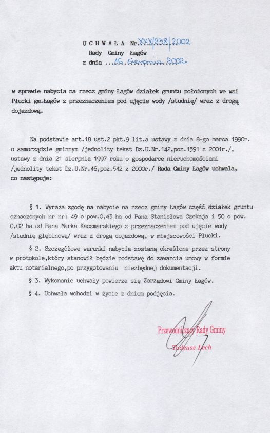 | Uchwała nr XXX/238/02 Rady Gminy Łagów z dn. 16 sierpnia 2002 r. w sprawie nabycia na rzecz gminy Łagów działek gruntu położonych we wsi Płucki gm. Łagów z przeznaczeniem pod ujęcie wody/studnię/ wraz z drogą dojazdową. | 2008-10-31 |