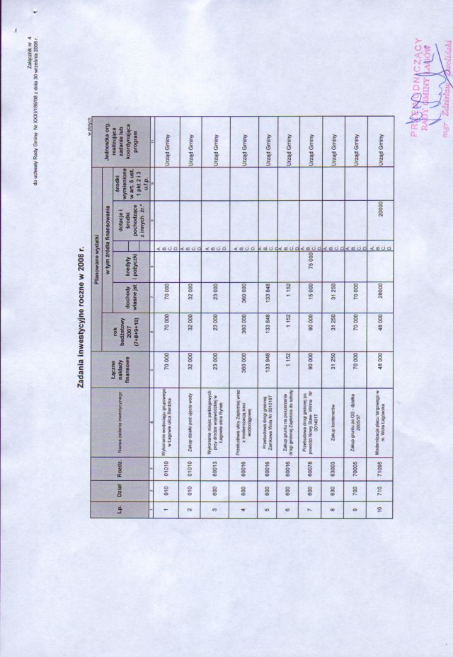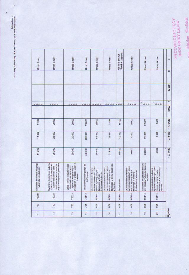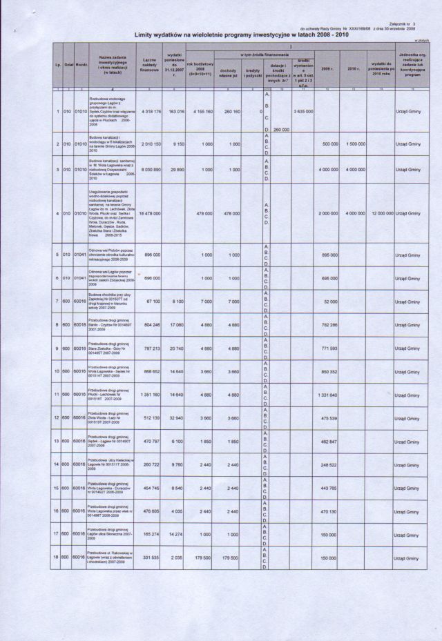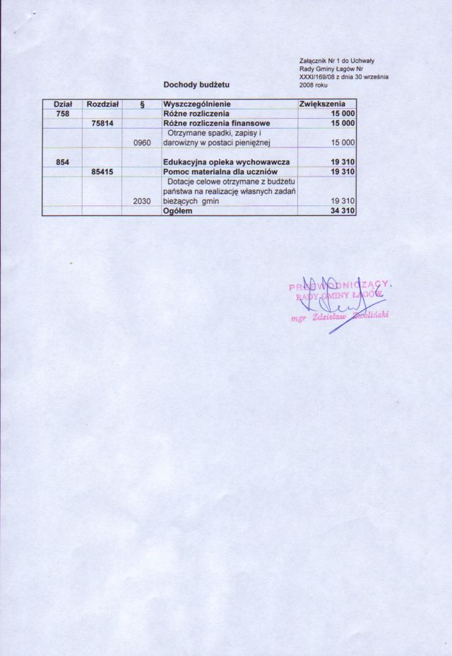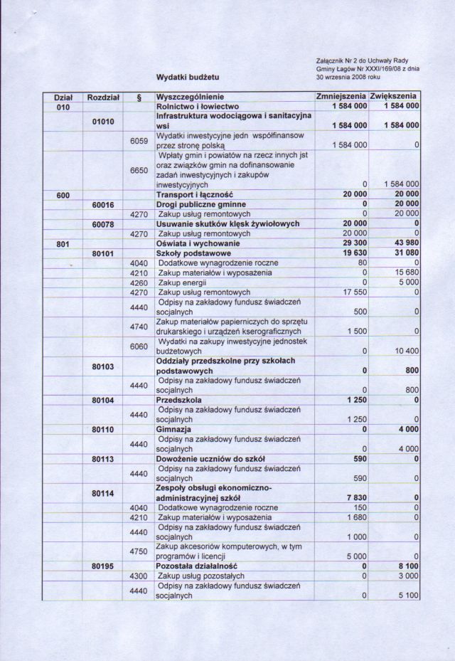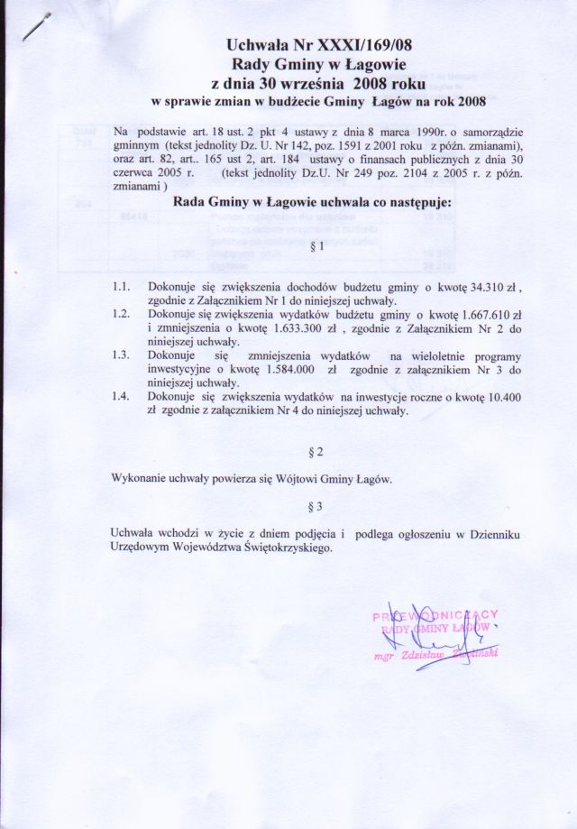 | Uchwała nr XXXI/169/08 Rady Gminy w Łagowie z dn. 30 września 2008 r. w sprawie zmian w budżecie Gminy Łagów na rok 2008. | 2008-10-08 |