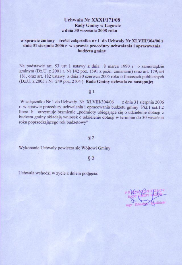 | Uchwała nr XXXI/171/08 Rady Gminy w Łagowie z dn. 30 września 2008 r. w sprawie zmiany treści załącznika nr 1 do Uchwały Nr XLVIII/304/06 z dnia 31 sierpnia 2006 r w sprawie procedury uchwalania i opracowania budżetu gminy. | 2008-10-08 |