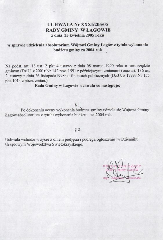 | Uchwała nr XXXI/205/05 Rady Gminy w Łagowie z dn. 25 kwietnia 2005 r. w sprawie udzielenia absolutorium Wójtowi Gminy Łagów z tytułu budżetu gminy za 2004 rok. | 2008-10-17 |