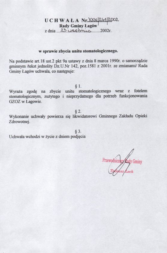 | Uchwała nr XXXI/241/02 Rady Gminy Łagów z dn. 23 września 2002 r. w sprawie zbycia unitu stomatologicznego. | 2008-10-31 |