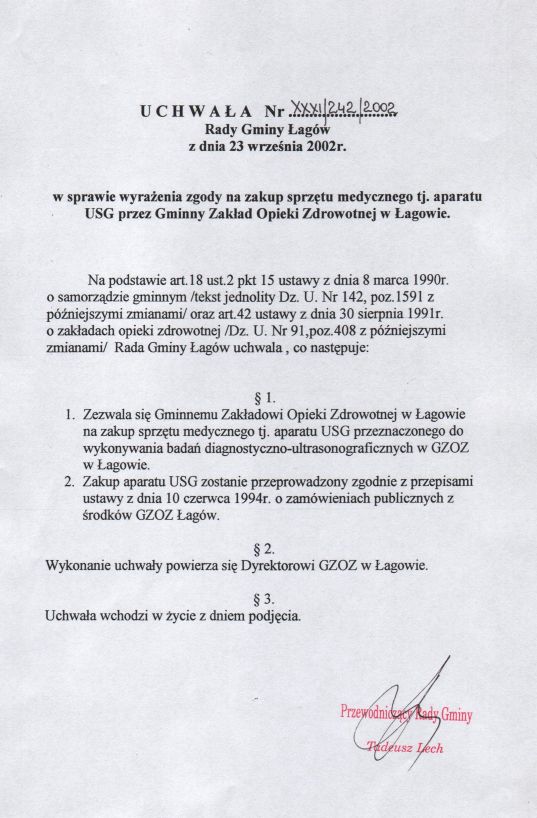 | Uchwała nr XXXI/242/02 Rady Gminy Łagów z dn. 23 września 2002 r. w sprawie wyrażenia zgody na zakup sprzętu medycznego tj. aparatu USG przez Gminny Zakład Opieki Zdrowotnej w Łagowie. | 2008-10-31 |
