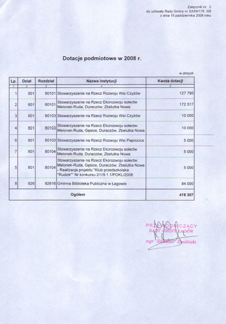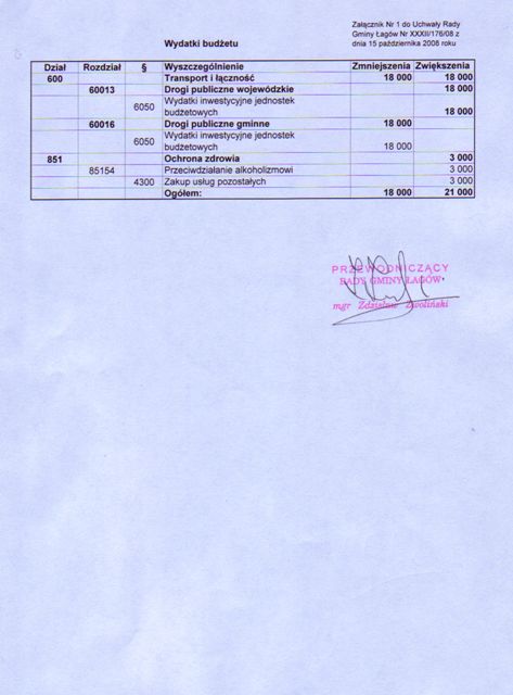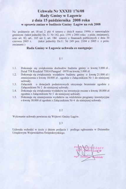 | Uchwała nr XXXII/176/08 Rady Gminy w Łagowie z dn. 15 października 2008 r. w sprawie zmian w budżecie Gminy Łagów na rok 2008. | 2008-10-22 |