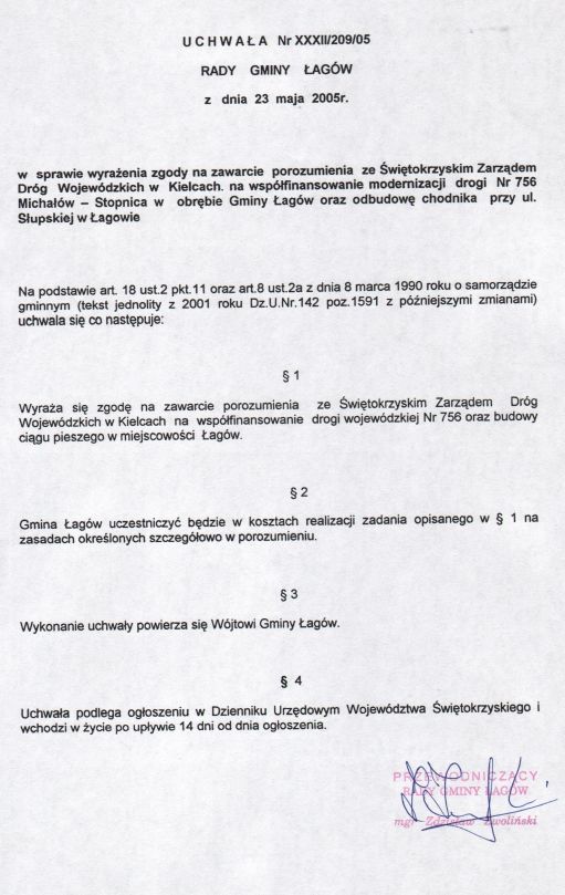 | Uchwała nr XXXII/209/05 Rady Gminy w Łagowie z dn. 23 maja 2005 r. w sprawie wyrażenia zgody na zawarcie porozumienia ze Świętokrzyskim Zarządem Dróg Wojewódzkich w Kielcach. na współfinansowanie modernizacji drogi Nr 756. | 2008-10-17 |
