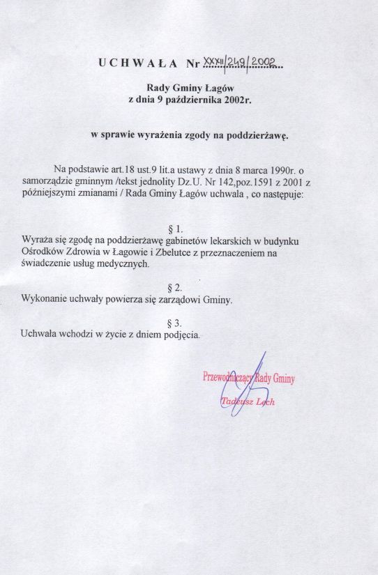 | Uchwała nr XXXII/249/02 Rady Gminy Łagów z dn. 9 października 2002 r. w sprawie wyrażenia zgody na poddzierżawę. | 2008-10-31 |