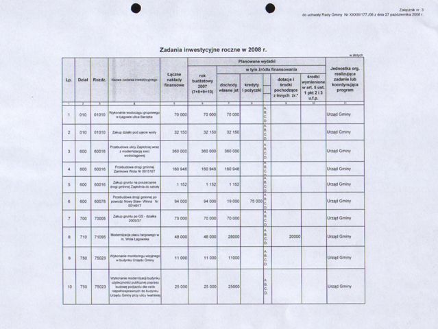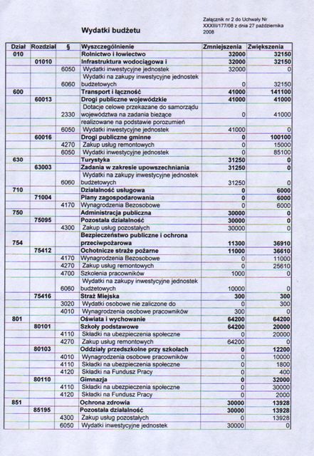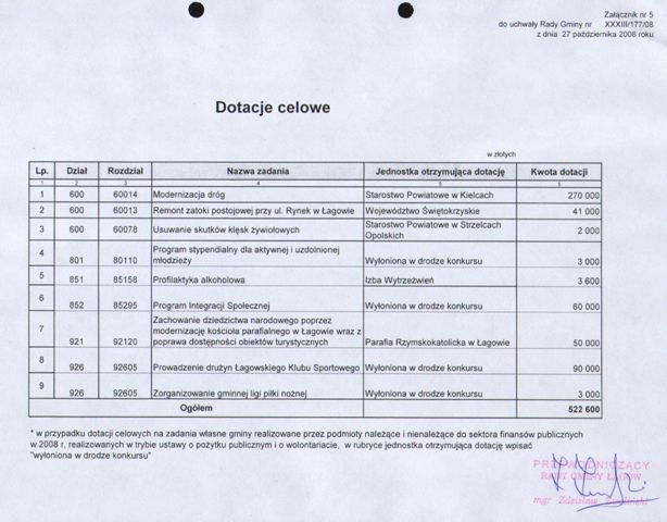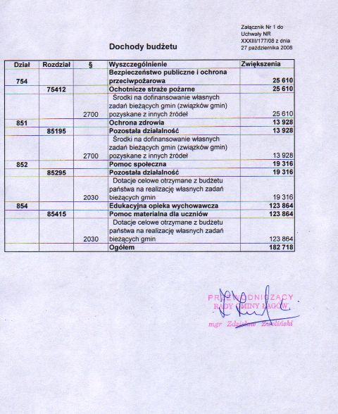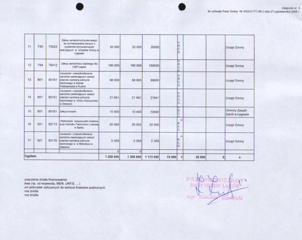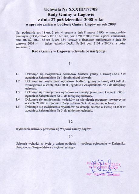 | Uchwała Nr XXXIII/177/08 Rady Gminy w Łagowie z dnia 27 października 2008 roku w sprawie zmian w budzecie Gminy Łagów na rok 2008 | 2008-12-03 |