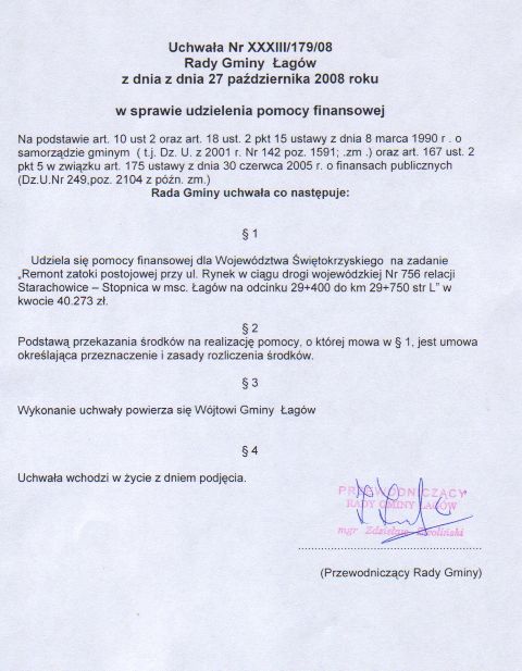 | Uchwała Nr XXXIII/179/08 Rady Gminy w Łagowie z dnia 27 października 2008 roku w sprawie udzielenia pomocy finansowej | 2008-12-03 |