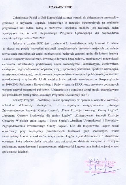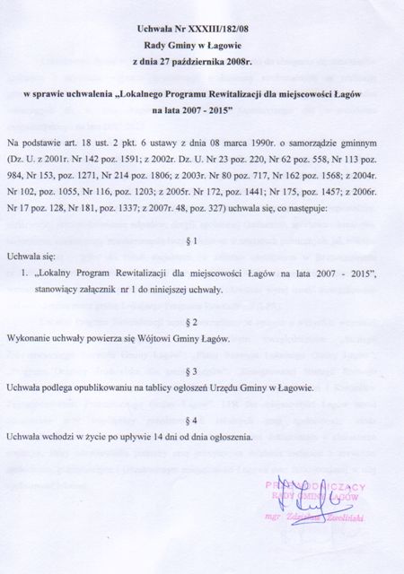 | Uchwała Nr XXXIII/182/08 Rady Gminy w Łagowie z dnia 27 października 2008 roku w sprawie uchwalenia "Lokalnego Programu Rewitalizacji dla miejscowości Łagów na lata 2007 - 2015" | 2008-12-03 |