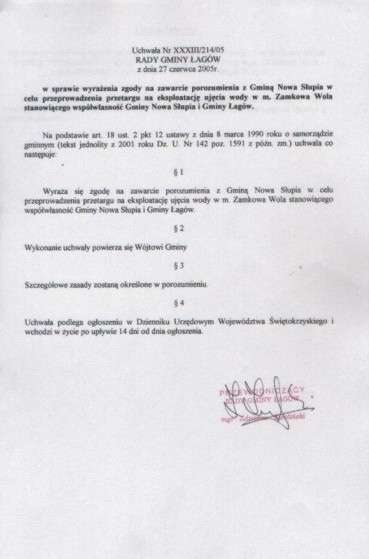 | Uchwała nr XXXIII/214/05 Rady Gminy w Łagowie z dn. 27 czerwca 2005 r. w sprawie wyrażenia zgody na zawarcie porozumienia z Gminą Nowa Słupia w celu przeprowadzenia przetargu na eksploatację ujęcia wody w m. Zamkowa Wola | 2008-10-17 |
