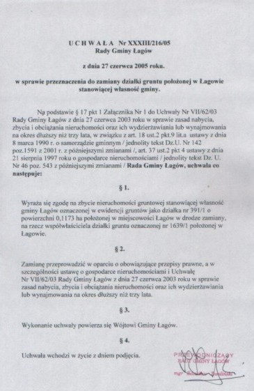 | Uchwała nr XXXIII/216/05 Rady Gminy w Łagowie z dn. 27 czerwca 2005 r. w sprawie przeznaczenia do zamiany działki gruntu położonej w Łagowie stanowiącej własność gminy. | 2008-10-17 |