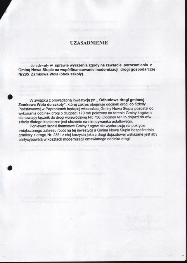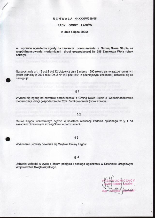 | Uchwała nr XXXIV/219/05 Rady Gminy w Łagowie z dn 5 lipca 2005 r. w sprawie wyrażenia zgody na zawarcie porozumienia z Gminą Nowa Słupia na współfinansowanie modernizacji drogi gospodarczej Nr 285 Zamkowa Wola (obok szkoły). | 2008-10-17 |