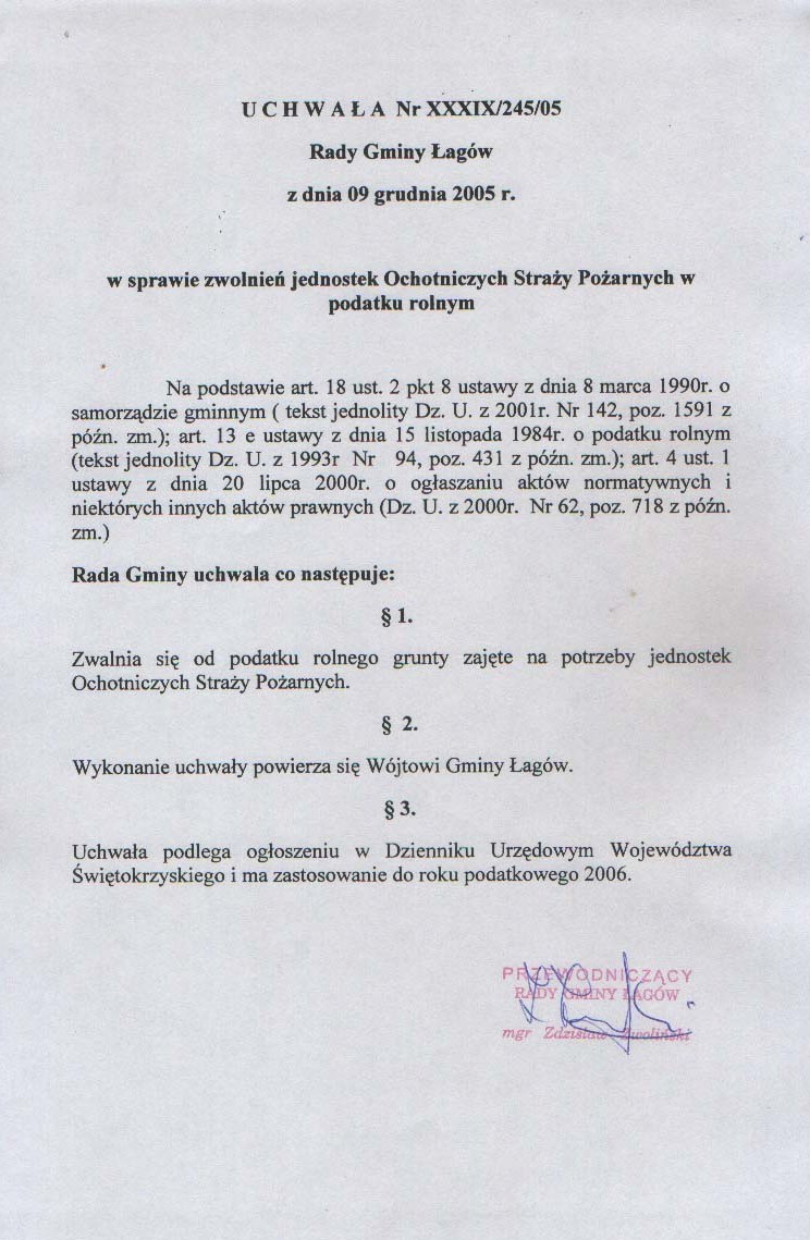 | Uchwała nr XXXIX/245/05 Rady Gminy w Łagowie z dn. 9 grudnia 2005 r. w sprawie zwolnieĂą jednostek Ochotniczych Straży Pożarnych w podatku rolnym. | 2008-10-22 |