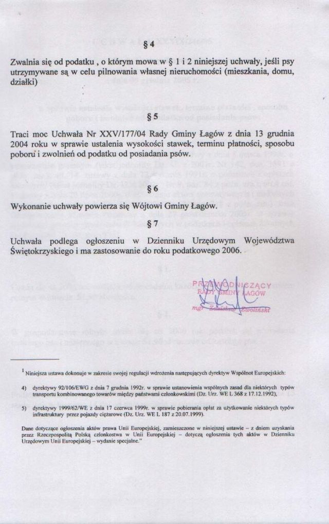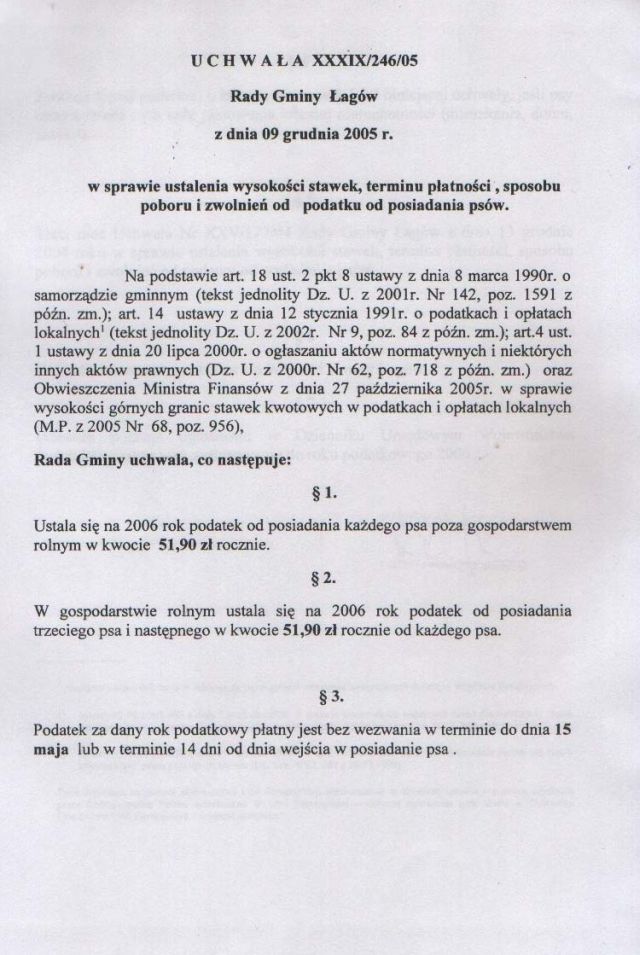 | Uchwała nr XXXIX/246/05 Rady Gminy w Łagowie z dn. 9 grudnia 2005 r. w sprawie ustalenia wysokości stawek, terminu płatności, sposobu poboru i zwolnieĂą od podatku od posiadania psów. | 2008-10-22 |