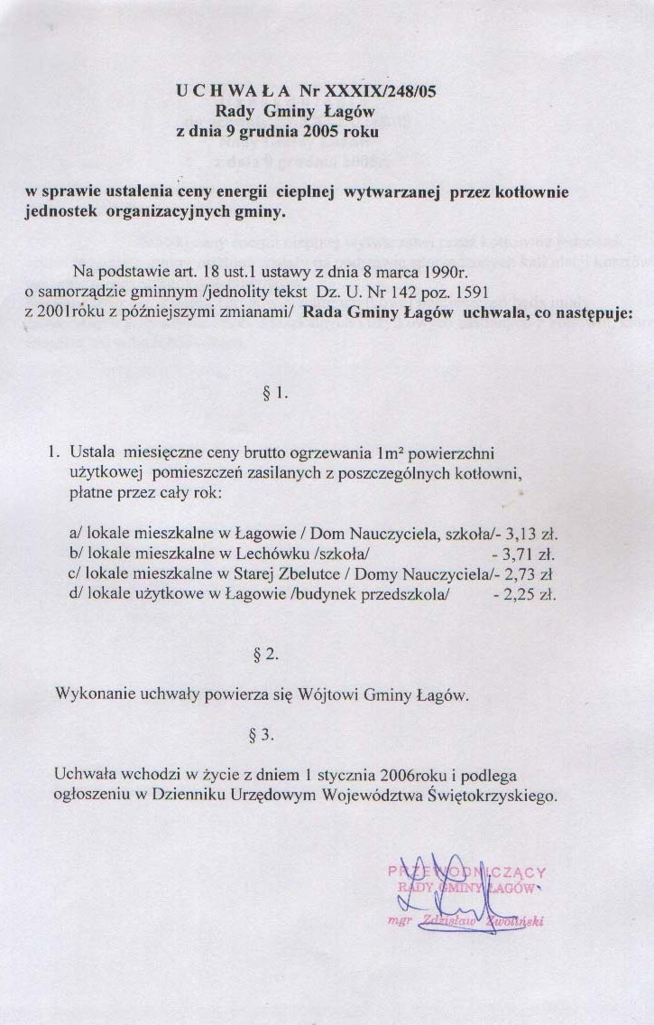 | Uchwała nr XXXIX/248/05 Rady Gminy w Łagowie z dn. 9 grudnia 2005 r. w sprawie ustalenia ceny energii cieplnej wytwarzanej przez kotłownie jednostek organizacyjnych gminy. | 2008-10-22 |