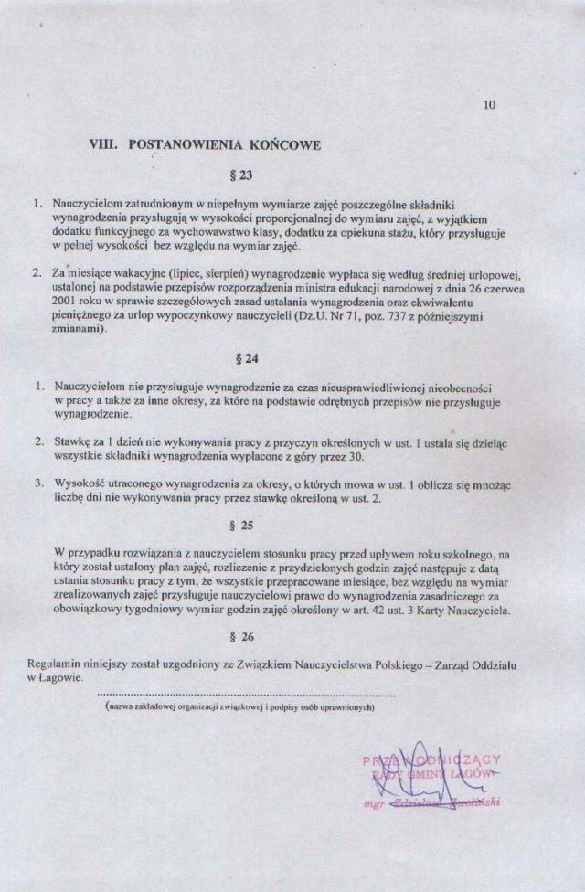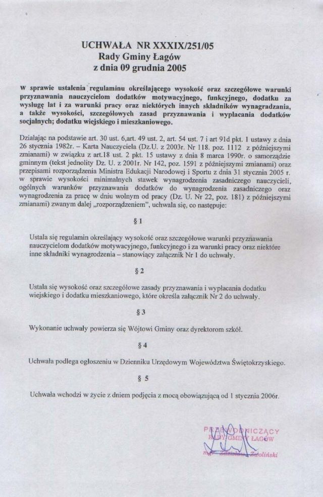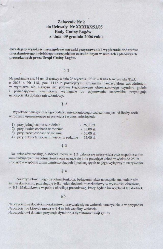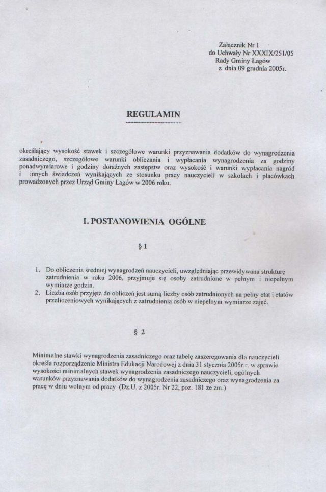 | Uchwała nr XXXIX/251/05 Rady Gminy w Łagowie z dn. 9 grudnia 2005 r. w sprawie ustalenia regulaminu określającego wysokość oraz szczegółowe warunki przyznawania nauczycielom dodatków. | 2008-10-22 |