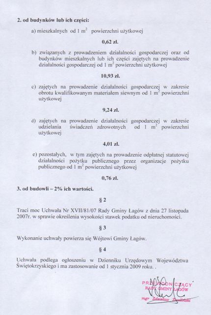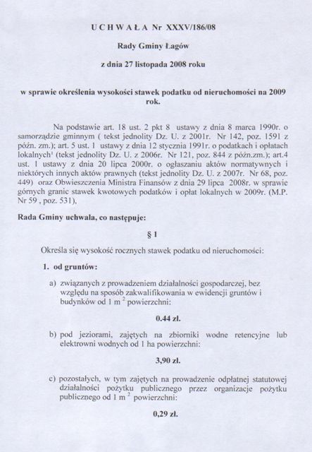 | Uchwała Nr XXXV/186/08 Rady Gminy w Łagowie z dnia 27 listopada 2008 roku sprawie określenia wysokości stawek podatku od nieruchomości na 2009r. | 2008-12-03 |
