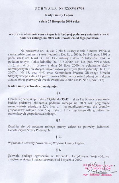| Uchwała Nr XXXV/187/08 Rady Gminy w Łagowie z dnia 27 listopada 2008 roku sprawie obniżenia ceny zakupu żyta będącej podstawą ustalenia stawki podatku rolnego na 2009 rok i zwolnienia od tego podatku | 2008-12-03 |