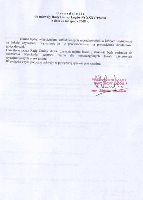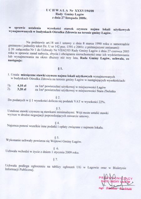 | Uchwała Nr XXXV/194/08 Rady Gminy w Łagowie z dnia 27 listopada 2008 roku w sprawie ustalenia wysokości stawek czynszu najmu lakali użytkowych wynajmowanych w budynkach Ośrodka Zdrowia na terenie gminy Łagów | 2008-12-03 |