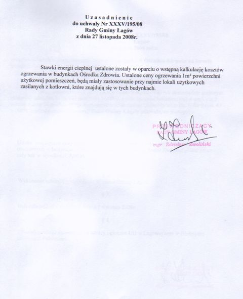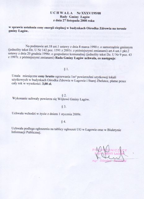 | Uchwała Nr XXXV/195/08 Rady Gminy w Łagowie z dnia 27 listopada 2008 roku w sprawie ustalenia ceny energii cieplnej w budynkach Ośrodka Zdrowia na terenie gminy Łagów. | 2008-12-03 |