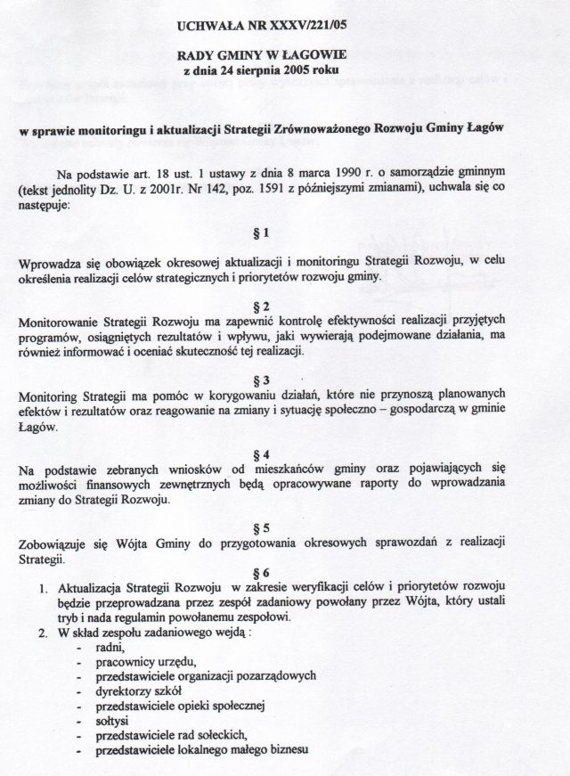 | Uchwała nr XXXV/221/05 Rady Gminy w Łagowie z dn. 24 sierpnia 2005 r. w sprawie monitoringu i aktualizacji Strategii Zrównoważonego Rozwoju Gminy Łagów. | 2008-10-17 |