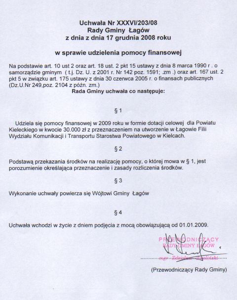| Uchwała Nr XXXVI/203/08 Rady Gminy w Łagowie z dn. 17 grudnia 2008 roku w sprawie udzielenia pomocy finansowej. | 2009-01-05 |