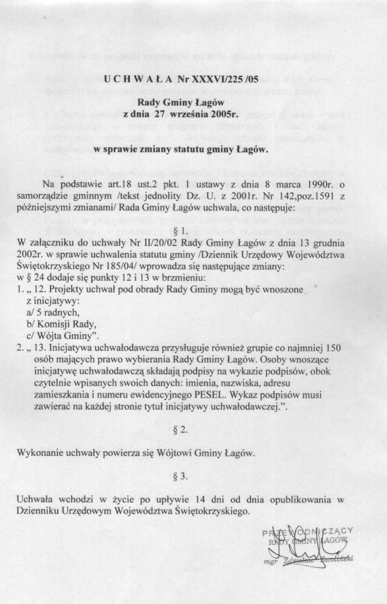 | Uchwała nr XXXVI/225/05 Rady Gminy w Łagowie z dn. 27 września 2005 r. w sprawie zmiany statutu gminy Łagów. | 2008-10-17 |