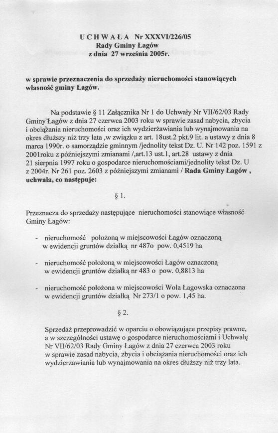 | Uchwała nr XXXVI/226/05 Rady Gminy w Łagowie z dn. 27 września 2005 r. w sprawie przeznaczenia do sprzedaży nieruchomości stanowiących własność gminy Łagów. | 2008-10-17 |